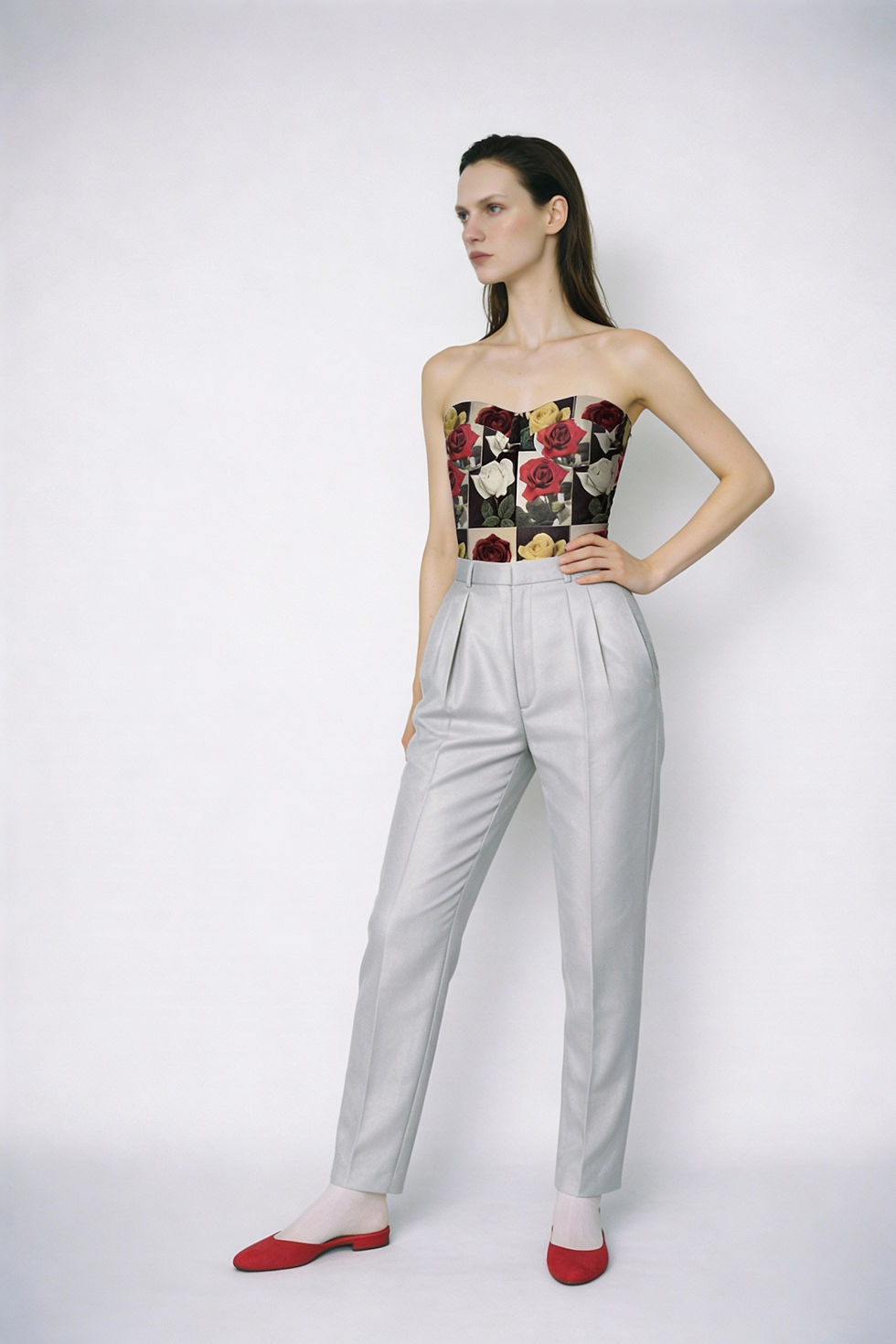 El Blazer Coincidencia reinterpreta la sastrería desde la suavidad de la tafeta estampada. Su estructura define el cuerpo sin rigidez, generando una presencia clara que se sostiene tanto de día como de noche.